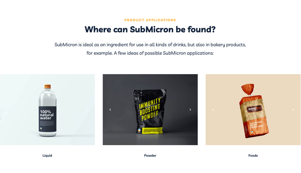 This innovative solution makes it a simple matter to mix fat-soluble ingredients into drinks or food without impacting aspects such as colour or transparency. More importantly: SubMicron offers enormous health benefits, such as the ability to add vitamins to drinks and other food products that can normally only be ingested in capsule form. SubMicron products make it easy, as the vitamins are already incorporated in your food or drink. That means there’s no need to take supplements to be sure you are getting enough of these vitamins. Furthermore, SubMicron technology improves the active ingredients’ bioavailability.
